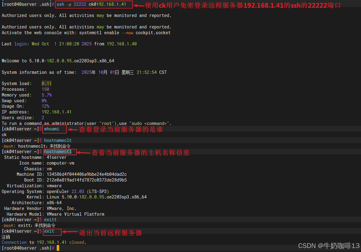 #若远程服务器的端口不是默认的22端口则需要指定端口【ssh -p 免密登录服务器的端口号 用户名称@免密登录服务器的IP】(如:可以使用ck用户免密登录远程服务器192.168.1.41且该服务器的ssh端口是22222)