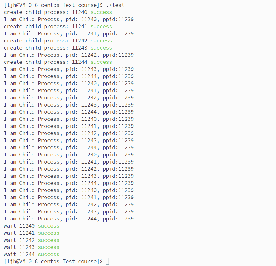 这段代码中,父进程创建 5 个子进程后,每个子进程仅循环 5 次就退出并进入僵尸状态;父进程继续执行自身休眠 10 秒的任务,待自身任务完成后,才通过循环调用 wait 阻塞回收已处于僵尸状态的多个子进程,最终 “wait 进程 ID success” 依次标识所有僵尸进程被成功清理,无资源残留。