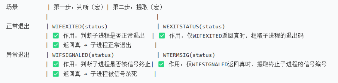2、状态检测:获取子进程的退出状态(如正常结束、被信号终止等)