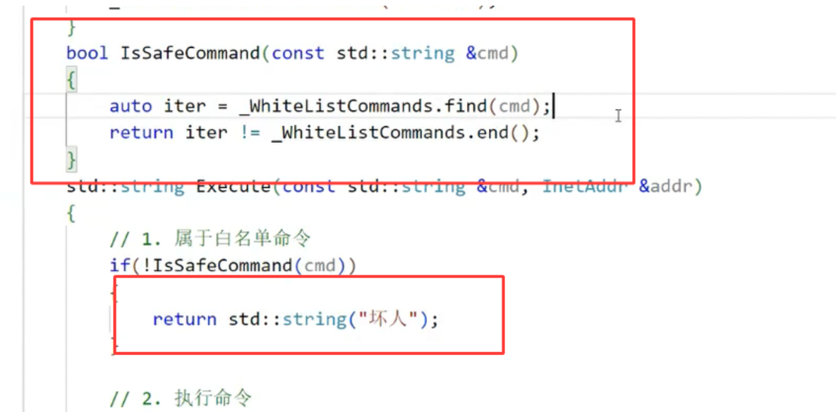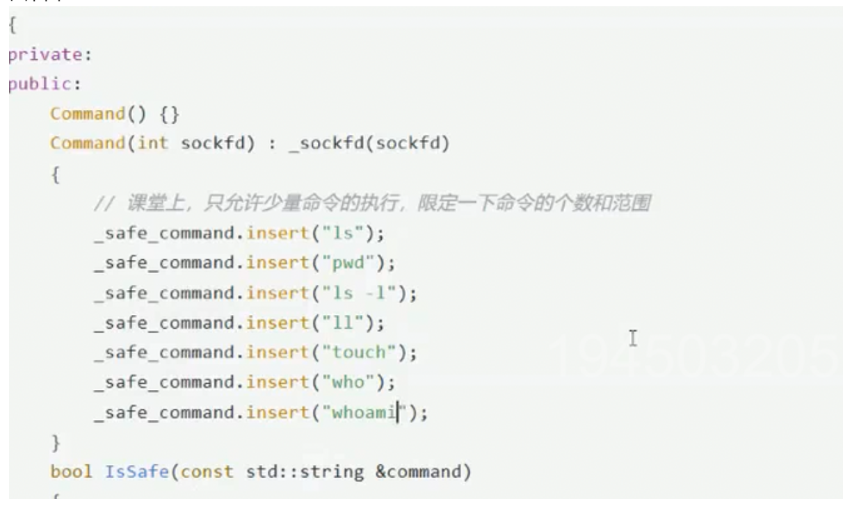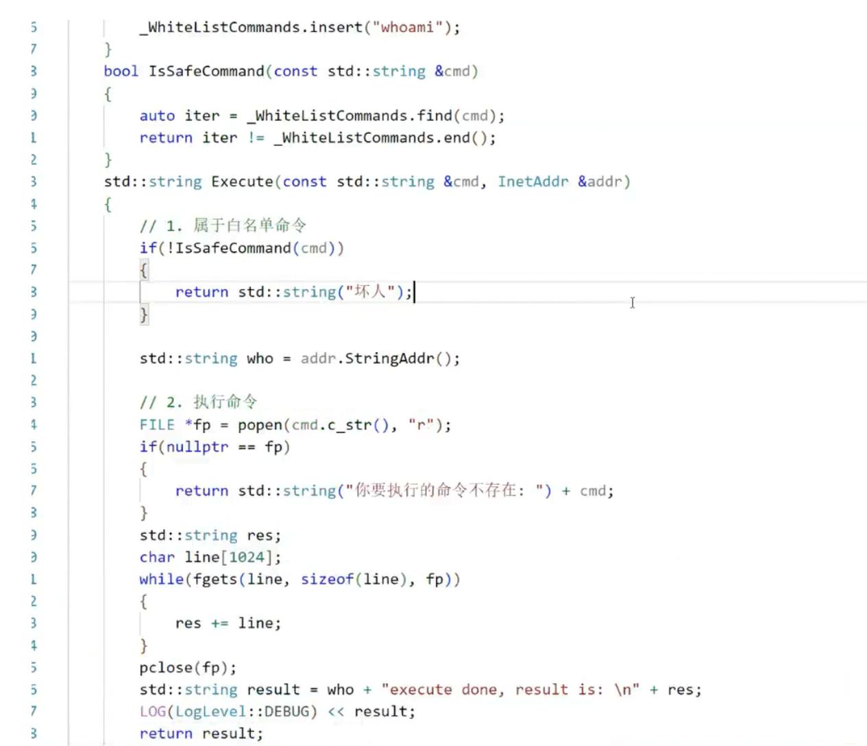 如果直接执行客户端发来的命令,风险极大 —— 比如客户端发rm -rf /,服务器直接玩完。所以必须做白名单:只允许执行指定的安全命令。